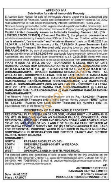 RESIDENTIAL FLAT NO. 304 ON 3RD FLOOR, HAVING BUILT-UP AREA 49.10 SQ. MTS. IN BUILDING KNOWN AS SHUBHAM PALACE, COMMERCIAL CUM RESIDENTIAL BUILDING LAYING AND BEING ON TOTAL LAND ADMEASURING 591-61 SQ. MTS, OF PLOT NO. 1 AND 2 OF SHUBHAM PARK, SITUATED AT KOTHARIYA REVENUE SURVEY NO. 133 (P) 2 OF NON AGRICULTURAL LAND FOR RESIDENTIAL PURPOSE, WHICH IS INCLUDED IN RAJKOT MUNICIPAL CORPORATION IN REGISTRATION SUB DISTRICT RAJKOT AND DISTRICT RAJKOT-360002, GUJARAT.