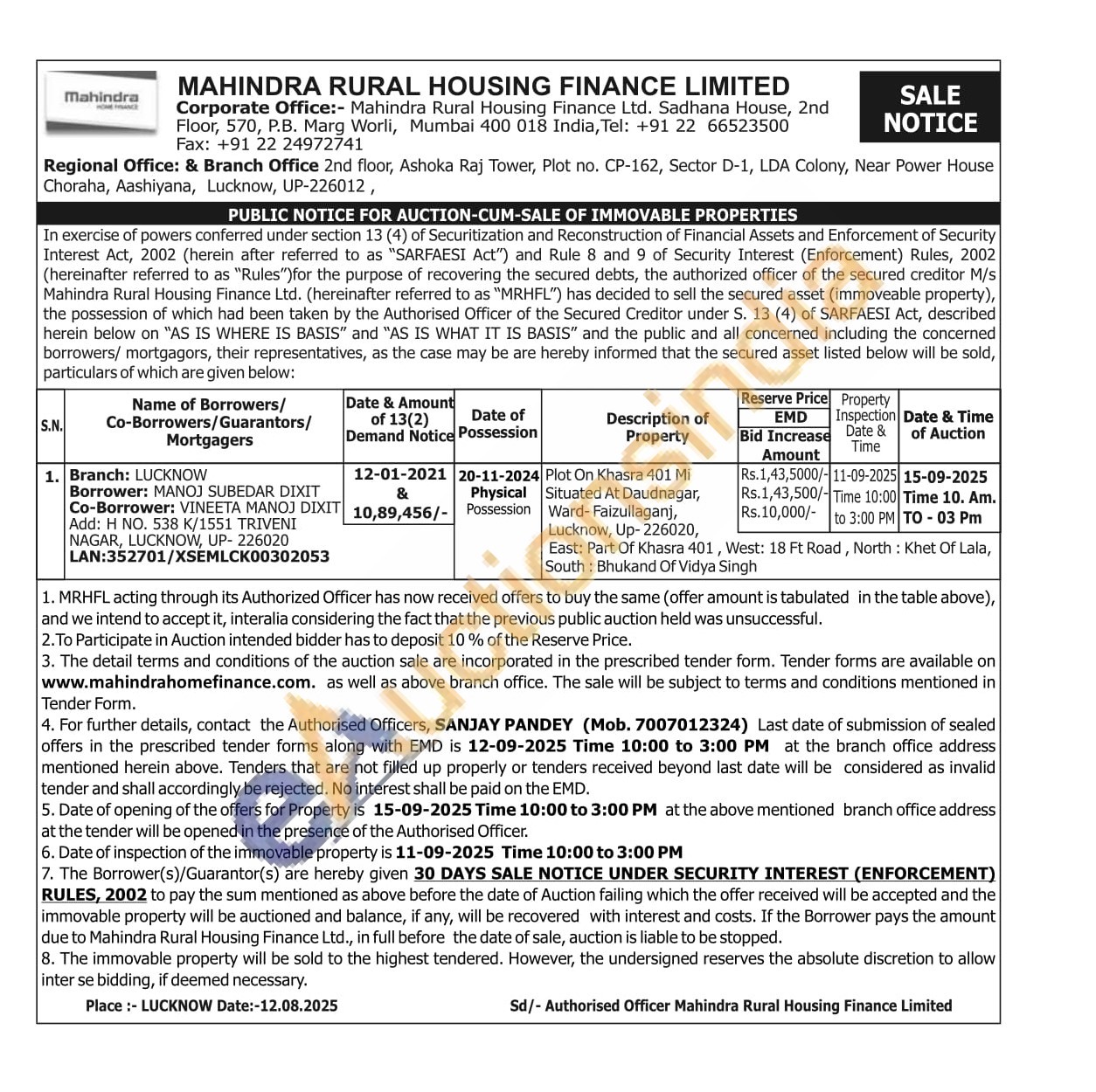 Plot On Khasra 401 Mi Situated At Daudnagar, Ward-Faizullaganj, Lucknow, Up-226020, East: Part Of Khasra 401, West: 18 Ft Road, North: Khet Of Lala, South: Bhukand Of Vidya Singh