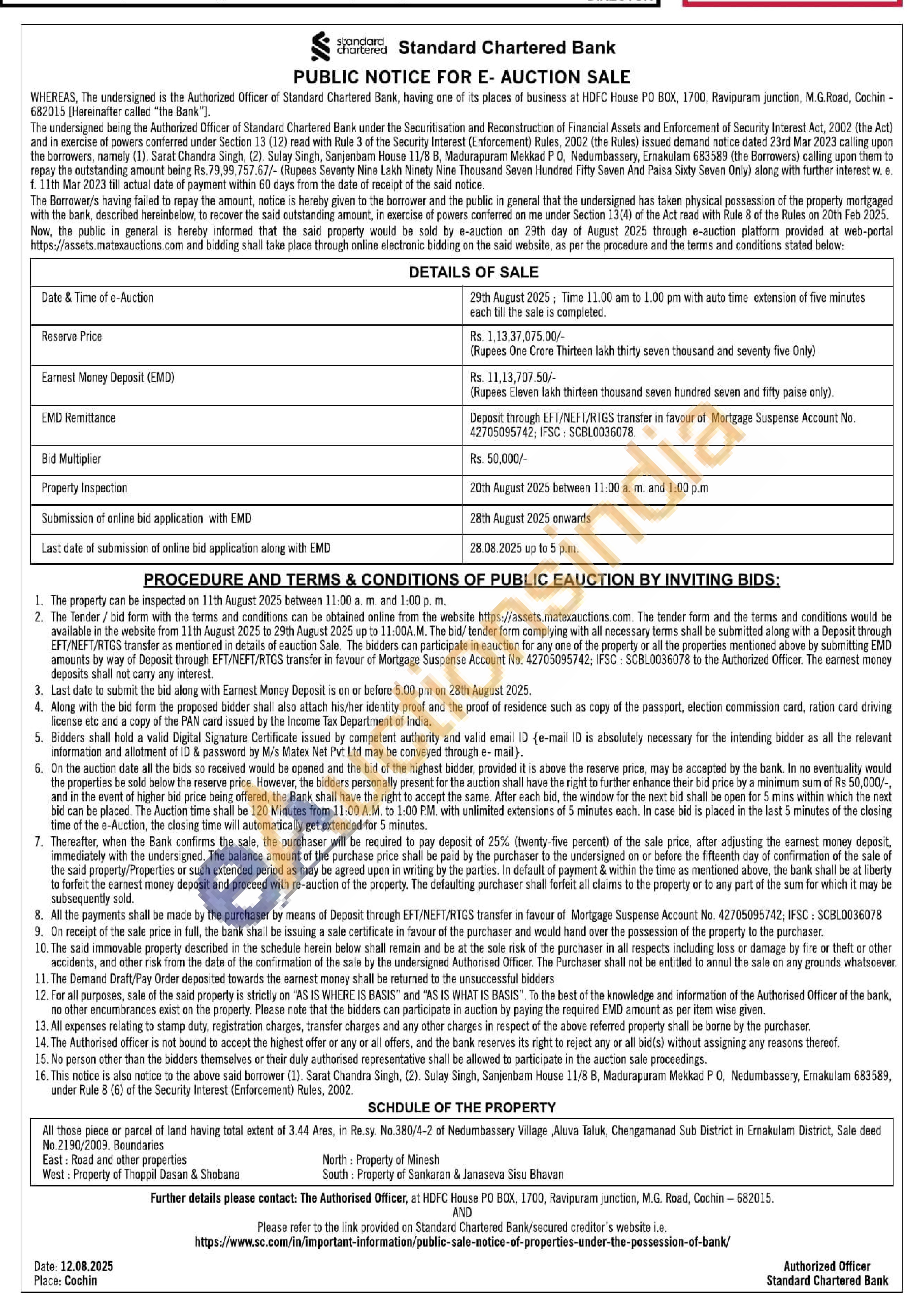 All those piece or parcel of land having total extent of 3.44 Ares, in Re.sy. No.380/4-2 of Nedumbassery Village, Aluva Taluk, Chengamened Sub District in Emakulam District, Sale deed