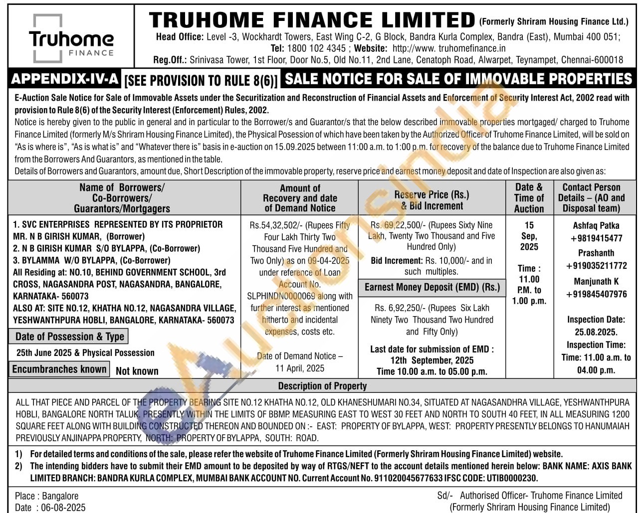 ALL THAT PIECE AND PARCEL OF THE PROPERTY BEARING SITE NO.12 KHATHA NO.12, OLD KHANESHUMARI NO.34, SITUATED AT NAGASANDHRA VILLAGE, YESHWANTHPURA HOBLI, BANGALORE NORTH TALUK. PRESENTLY WITHIN THE LIMITS OF BBMP. MEASURING EAST TO WEST 30 FEET AND NORTH TO SOUTH 40 FEET, IN ALL MEASURING 1200 SQUARE FEET ALONG WITH BUILDING CONSTRUCTED THEREON AND BOUNDED ON :- EAST: PROPERTY OF BYLAPPA, WEST: PROPERTY PRESENTLY BELONGS TO HANUMAIAH PREVIOUSLY ANJINAPPA PROPERTY, NORTH: PROPERTY OF BYLAPPA, SOUTH: ROAD