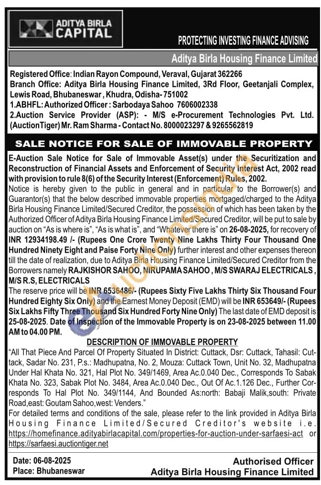 "All That Piece And Parcel Of Property Situated In District: Cuttack, Dsr: Cuttack, Tahasil: Cut-tack, Sadar No. 231, P.s.: Madhupatna, No. 2, Mouza: Cuttack Town, Unit No. 32, Madhupatna Under Hal Khata No. 321, Hal Plot No. 349/1469, Area Ac.0.040 Dec., Corresponds To Sabak Khata No. 323, Sabak Plot No. 3484, Area Ac.0.040 Dec., Out Of Ac. 1.126 Dec., Further Cor-responds To Hal Plot No. 349/1144, And Bounded As:north: Babaji Malik, south: Private Road, east: Goutam Sahoo, west: Venders."