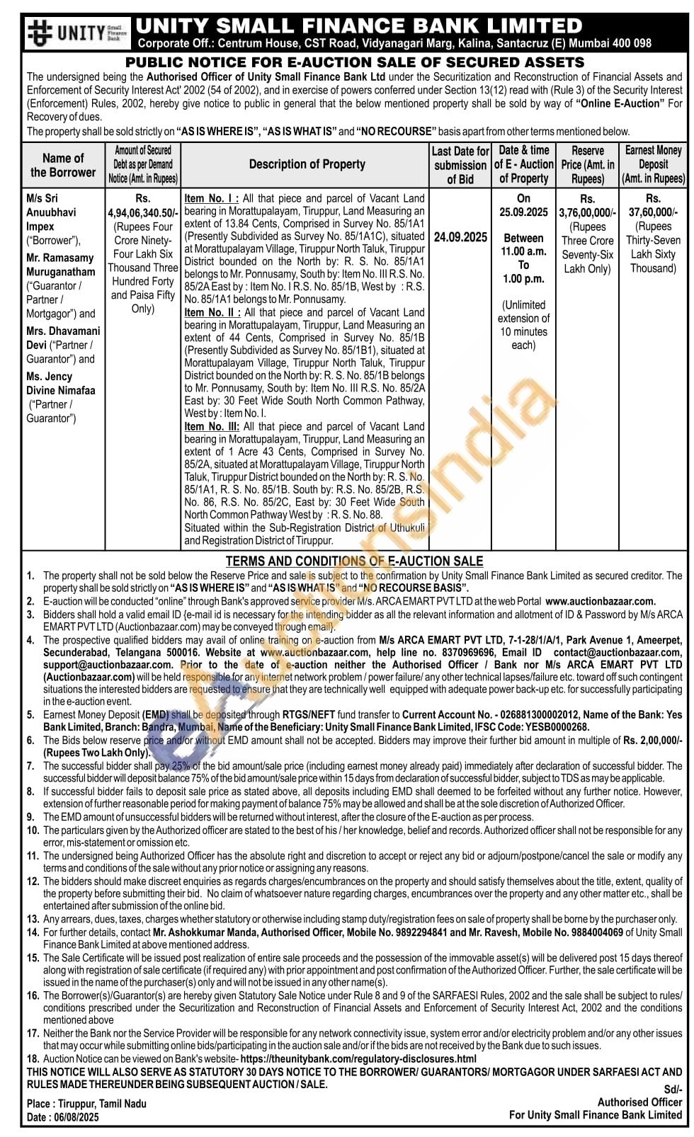 Item No. 1: All that piece and parcel of Vacant Land - bearing in Morattupalayam, Tiruppur, Land Measuring an extent of 13.84 Cents, Comprised in Survey No. 85/1A1 - (Presently Subdivided as Survey No. 85/1A1C), situated 24.09.2025 at Morattupalayam Village, Tiruppur North Taluk, Tiruppur District bounded on the North by: R. S. No. 85/1A1 belongs to Mr. Ponnusamy, South by: Item No. III R.S. No. 85/2A East by: Item No. IR.S. No. 85/1B, West by : R.S. No. 85/1A1 belongs to Mr. Ponnusamy.Item No. II: All that piece and parcel of Vacant Land bearing in Morattupalayam, Tiruppur, Land Measuring an extent of 44 Cents, Comprised in Survey No. 85/18 (Presently Subdivided as Survey No. 85/181), situated at Morattupalayam Village, Tiruppur North Taluk, Tiruppur District bounded on the North by: R. S. No. 85/18 belongs to Mr. Ponnusamy, South by: Item No. III R.S. No. 85/2A East by: 30 Feet Wide South North Common Pathway, West by: Item No. 1.Item No. III: All that piece and parcel of Vacant Land bearing in Morattupalayam, Tiruppur, Land Measuring an extent of 1 Acre 43 Cents, Comprised in Survey No. 85/2A, situated at Morattupalayam Village, Tiruppur North Taluk, Tiruppur District bounded on the North by: R. S. No. 85/1A1, R. S. No. 85/1B. South by: R.S. No. 85/2B, R.S. No. 86, R.S. No. 85/2C, East by: 30 Feet Wide South North Common Pathway West by: R. S. No. 88. Situated within the Sub-Registration District of Uthukuli and Registration District of Tiruppur.