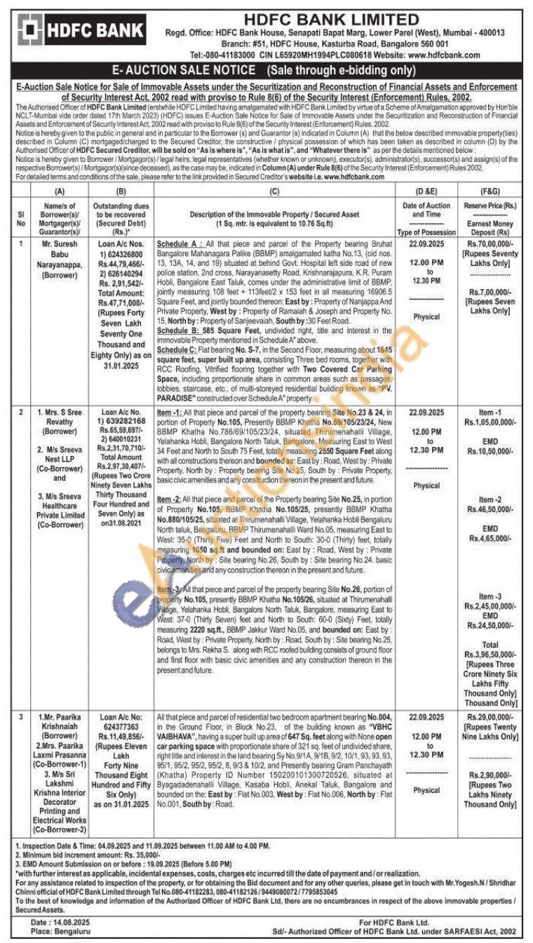3) All that piece and parcel of residential two bedroom apartment bearing No.004, in the Ground Floor, in Block No.23. of the building known as "VBHC VAIBHAVA", having a super built up area of 647 Sq. feet along with None open car parking space with proportionate share of 321 sq. feet of undivided share, right title and interest in the land bearing Sy No.9/1A, 9/18, 9/2, 10/1, 93, 93, 93, 95/1, 95/2, 95/2, 95/2, 8, 9/3 & 10/2, and Presently bearing Gram Panchayath (Khatha) Property ID Number 150200101300720526, situated at Byagadadenahalli Village, Kasaba Hobli, Anekal Taluk, Bangalore and bounded on the East by: Flat No.003, West by: Flat No.006. North by: Flat No.001, South by Road