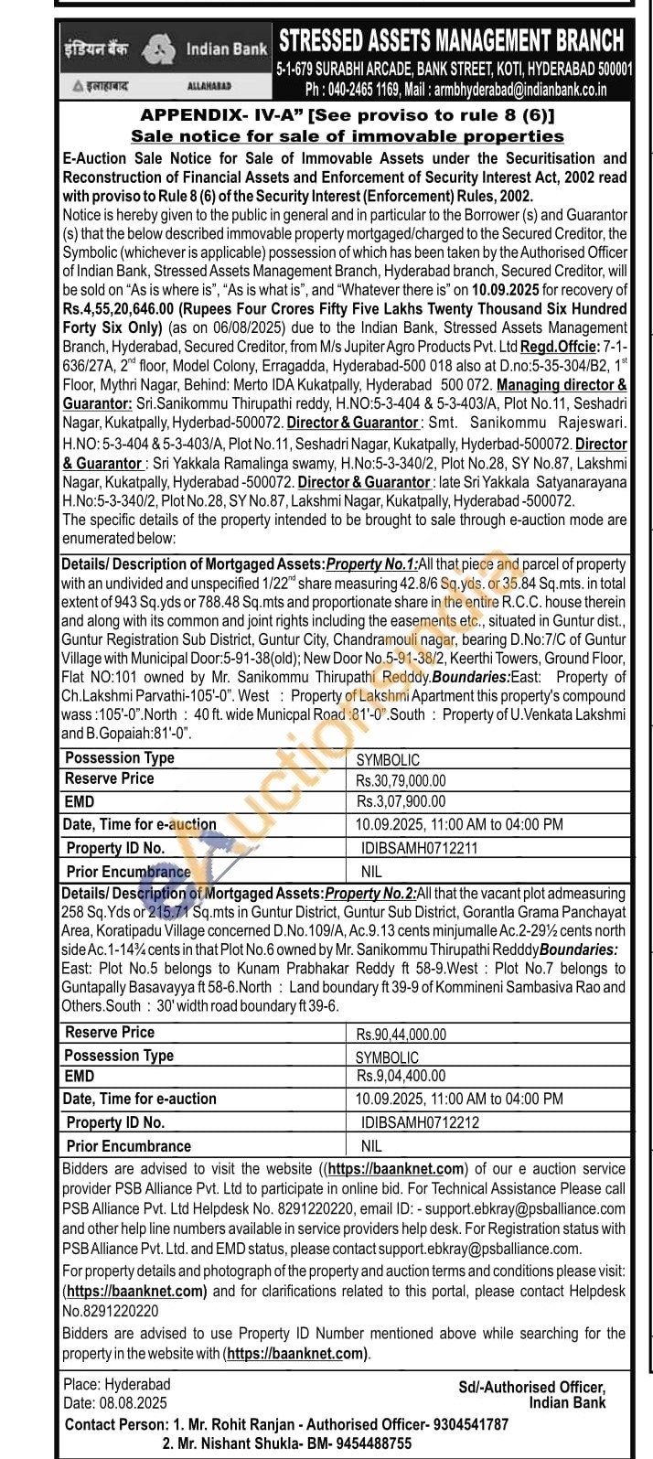 Details/Description of Mortgaged Assets: Property No.2:All that the vacant plot admeasuring 258 Sq. Yds or 215.71 Sq.mts in Guntur District, Guntur Sub District, Gorantla Grama Panchayat Area, Koratipadu Village concerned D.No. 109/A, Ac.9.13 cents minjumalle Ac.2-29½ cents north side Ac. 1-14% cents in that Plot No.6 owned by Mr. Sanikommu Thirupathi Redddy Boundaries: East: Plot No.5 belongs to Kunam Prabhakar Reddy ft 58-9.West: Plot No.7 belongs to Guntapally Basavayya ft 58-6.North: Land boundary ft 39-9 of Kommineni Sambasiva Rao and Others.South: 30' width road boundary ft 39-6.