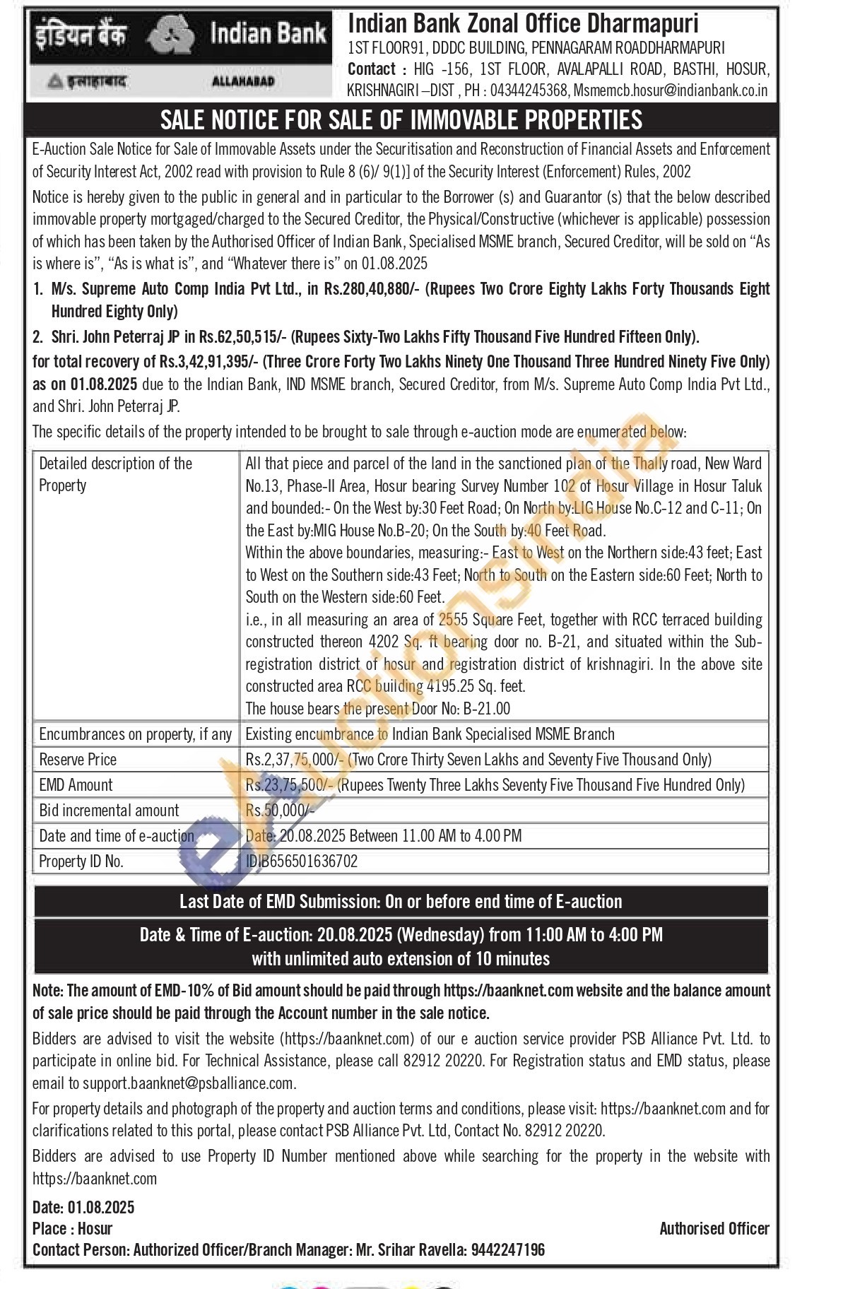 All that piece and parcel of the land in the sanctioned plan of the Thally road, New Ward No.13, Phase-II Area, Hosur bearing Survey Number 102 of Hosur Village in Hosur Taluk and bounded:- On the West by:30 Feet Road: On North by:LIG House No.C-12 and C-11; On the East by:MIG House No.B-20: On the South by:40 Feet Road.