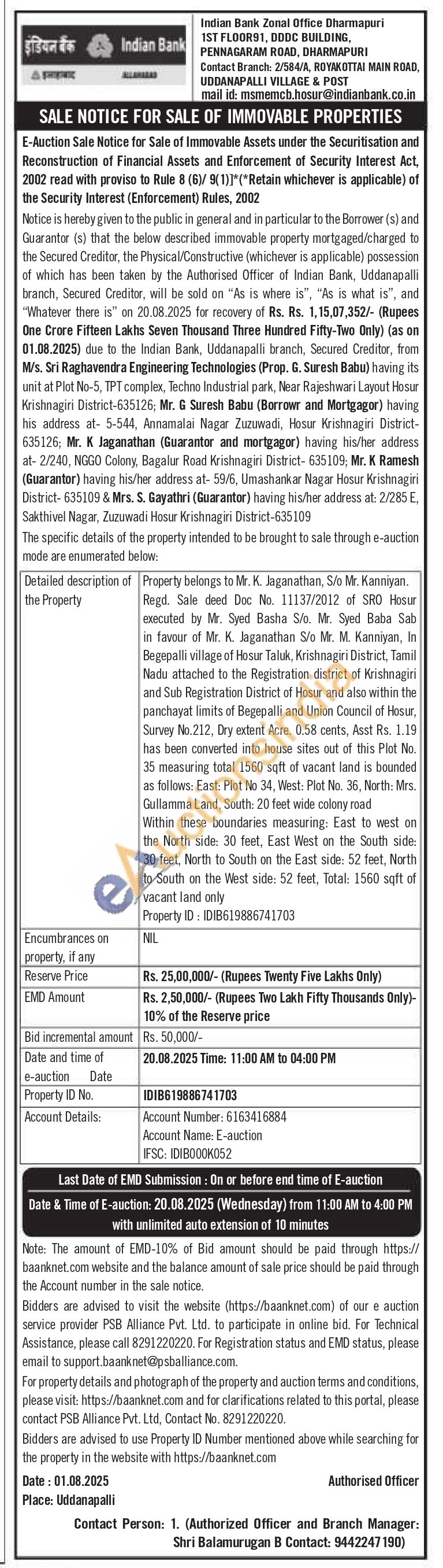 Property belongs to Mr. K. Jaganathan, S/o Mr. Kanniyan. Regd. Sale deed Doc No. 11137/2012 of SRO Hosur executed by Mr. Syed Basha S/o. Mr. Syed Baba Sab in favour of Mr. K. Jaganathan S/o Mr. M. Kanniyan, In Begepalli village of Hosur Taluk, Krishnagiri District, Tamil Nadu attached to the Registration district of Krishnagiri and Sub Registration District of Hosur and also within the panchayat limits of Begepalli and Union Council of Hosur, Survey No.212, Dry extent Acre, 0.58 cents, Asst Rs. 1.19 has been converted into house sites out of this Plot No. 35 measuring total 1560 sqft of vacant land is bounded as follows: East: Plot No 34, West: Plot No. 36, North: Mrs. Gullamma Land, South: 20 feet wide colony road Within these boundaries measuring: East to west on the North side: 30 feet, East West on the South side: 30 feet, North to South on the East side: 52 feet, North to South on the West side: 52 feet, Total: 1560 sqft of vacant land only Property ID: IDIB619886741703