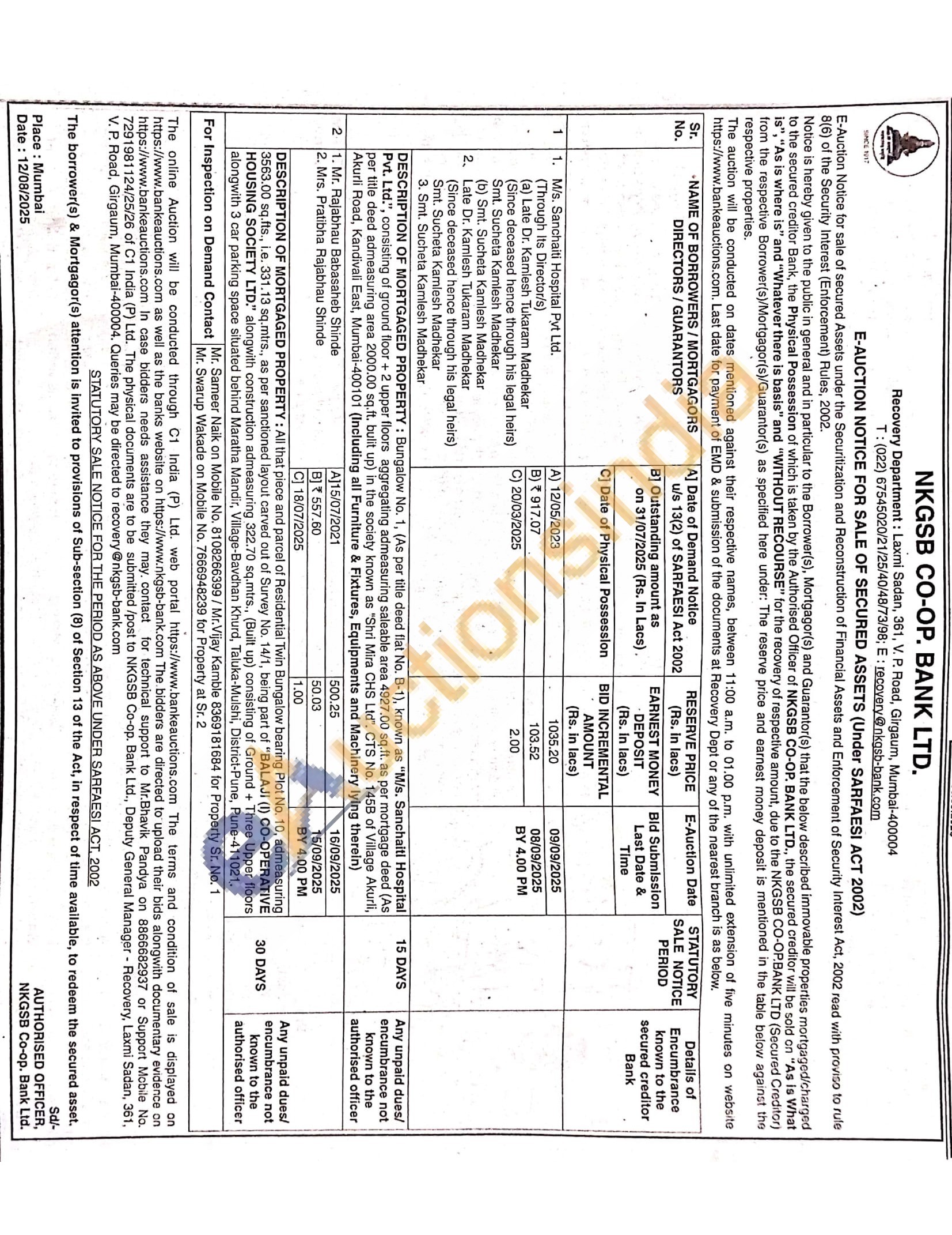 DESCRIPTION OF MORTGAGED PROPERTY: Bungalow No. 1, (As per title deed flat No. B-1), known as "M/s. Sanchaiti Hospital Pvt. Ltd.", consisting of ground floor + 2 upper floors aggregating admeasuring saleable area 4927.00 sq.ft. as per mortgage deed (As per title deed admeasuring area 2000.00 sq.ft, bulit up) in the society known as "Shri Mira CHS Ltd. CTS No. 145B of Village Akurli, Akurli Road, Kandivali East, Mumbai-400101 (Including all Furniture & Fixtures, Equipments and Machinery lying therein)