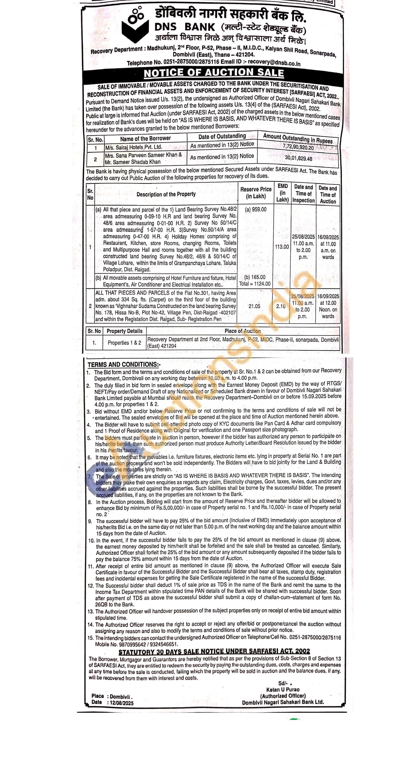 Authorized Officer on Telephone/Cell No. 0251-2875000/2875116 Mobile No. 9870995642/9324546651.