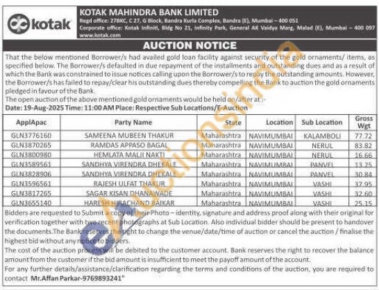 Kotak Mahindra Bank Gold Auctions Auction in Mumbai