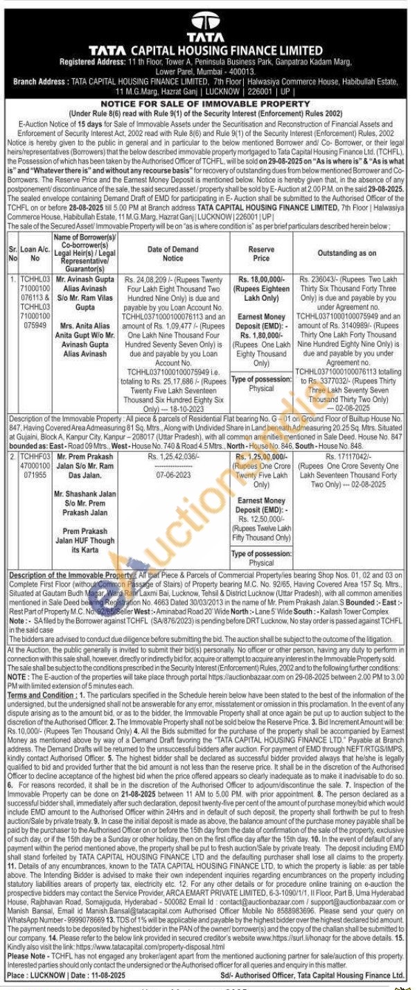 1) All piece & parcels of Residential Flat bearing No. G-01 on Ground Floor of Builtup House No. 847, Having Covered Area Admeasuring 81 Sq. Mtrs., Along with Undivided Share in Land beneath Admeasuring 20.25 Sq. Mtrs. Situated at Gujaini, Block A, Kanpur City, Kanpur-208017 (Uttar Pradesh), with all common amenities mentioned in Sale Deed. House No. 847 bounded as: East-Road 09 Mtrs, West-House No. 740 & Road 4.5 Mirs.. North-House No. 846, South-House No. 848.