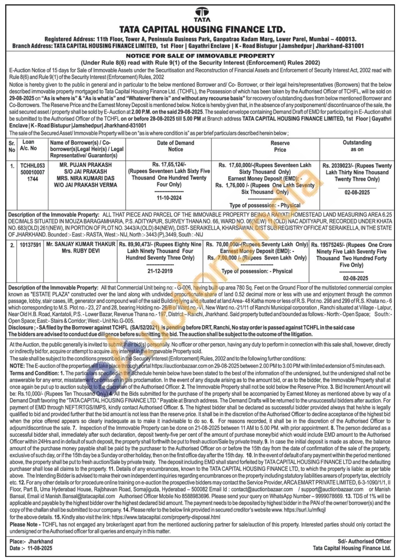 2) All that Commercial Unit being no: - G-006, having built-up area 780 Sq. Feet on the Ground Floor of the multistoried commercial complex known as "ESTATE PLAZA" constructed over the land along with undivided proportionate share of land 0.52 decimal more or less with use and enjoyment through the common passage, lobby, stair cases, lift, generator and compound wall of the said Building lying and situated at land Area-48 Katha more or less of R.S. Plot no. 298 and 299 of R.S. Khata no.-6 which corresponding to M.S. Plot no.-23, 27 and 28, bearing Holding no-26/B of Ward no.-VI, New Ward no.-21/11 of Ranchi Municipal corporation, Ranchi situated at Village - Lalpur, Near Old H.B. Road, Kantatoli, P.S.-Lower Bazar, Revenue Thana no.-197, District-Ranchi, Jharkhand. Said property butted and bounded as follows:- North:-Open Space; South:-Open Space; East:-Stairs & Corridor; West:-Unit No.G-005.