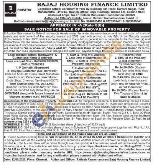 Description of the Immovable Property: SCHEDULE A: All that piece and parcel of land bearing Plot No 1 meas uring to an extent of 3253 sq ft, on the southern side out of total extent 6313 sq ft., (A per Sub division No. 3368/14 Lr. No 114/2014/A3 dated 27.03.2014) comprised in Survey no.86/1A Vide MMDA Approval No PD/LD/No 40/85, letter No. 02/6208/84, In the layout knows as "St Mary's Nagar" Situated at No. 1, Nadukuthagal Village, Avadi Taluk. Thiruvallur District being bounded on the North Land belongs to Mr. Sathish. South. Plot No 2.384 East: 30 Feet road West Survey No.83. Measurings: East to West on the Northern Side 118 Feet, East to West on the Southem Side 123 Feet, North to South on the Eastern Side: 31 Feet, North to South on the Western Side: 23 Feet. In all admeasuring 3253 sq.ft