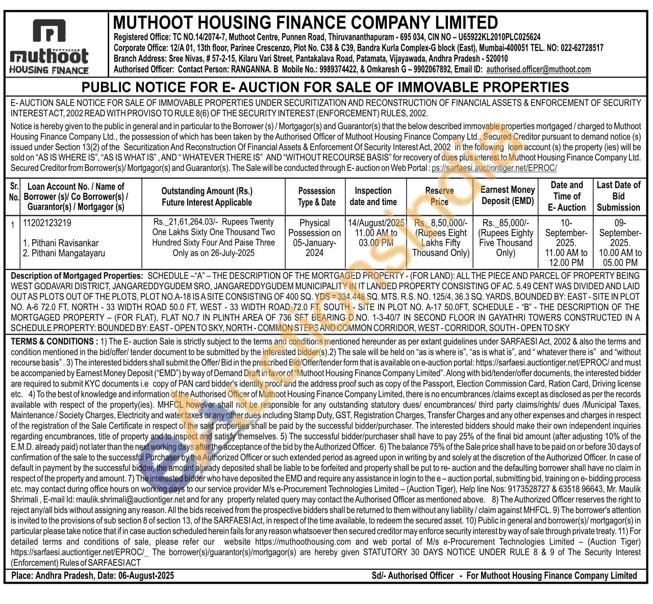 Description of Mortgaged Properties: SCHEDULE-"A" - THE DESCRIPTION OF THE MORTGAGED PROPERTY - (FOR LAND): ALL THE PIECE AND PARCEL OF PROPERTY BEING WEST GODAVARI DISTRICT, JANGAREDDYGUDEM SRO, JANGAREDDYGUDEM MUNICIPALITY IN IT LANDED PROPERTY CONSISTING OF AC. 5.49 CENT WAS DIVIDED AND LAID OUTAS PLOTS OUT OF THE PLOTS, PLOT NO.A-18 IS A SITE CONSISTING OF 400 SQ. YDS=334.448 SQ. MTS. R.S. NO. 125/4, 36.3 SQ. YARDS, BOUNDED BY: EAST - SITE IN PLOT NO. A-6 72.0 FT, NORTH-33 WIDTH ROAD 50.0 FT, WEST-33 WIDTH ROAD 72.0 FT, SOUTHSITE IN PLOT NO. A-17 50.0FT, SCHEDULE - "B" - THE DESCRIPTION OF THE MORTGAGED PROPERTY (FOR FLAT), FLAT NO.7 IN PLINTH AREA OF 736 SFT BEARING D.NO. 1-3-40/7 IN SECOND FLOOR IN GAYATHRI TOWERS CONSTRUCTED IN A SCHEDULE PROPERTY: BOUNDED BY: EAST-OPEN TO SKY, NORTH-COMMON STEPS AND COMMON CORRIDOR, WEST-CORRIDOR, SOUTH-OPEN TO SKY