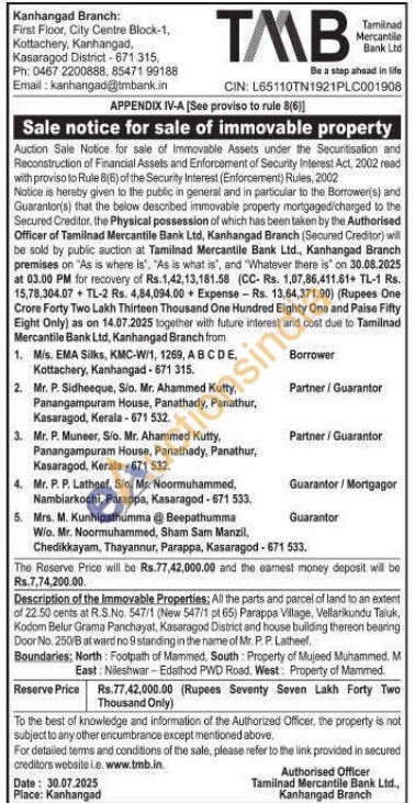 Description of the Immovable Properties; All the parts and parcel of land to an extent of 22.50 cents at R.S.No. 547/1 (New 547/1 pt 65) Parappa Village, Vellarikundu Taluk, Kodom Belur Grama Panchayat, Kasaragod District and house building thereon bearing Door No. 250/B at ward no 9 standing in the name of Mr. P. P. Latheef,