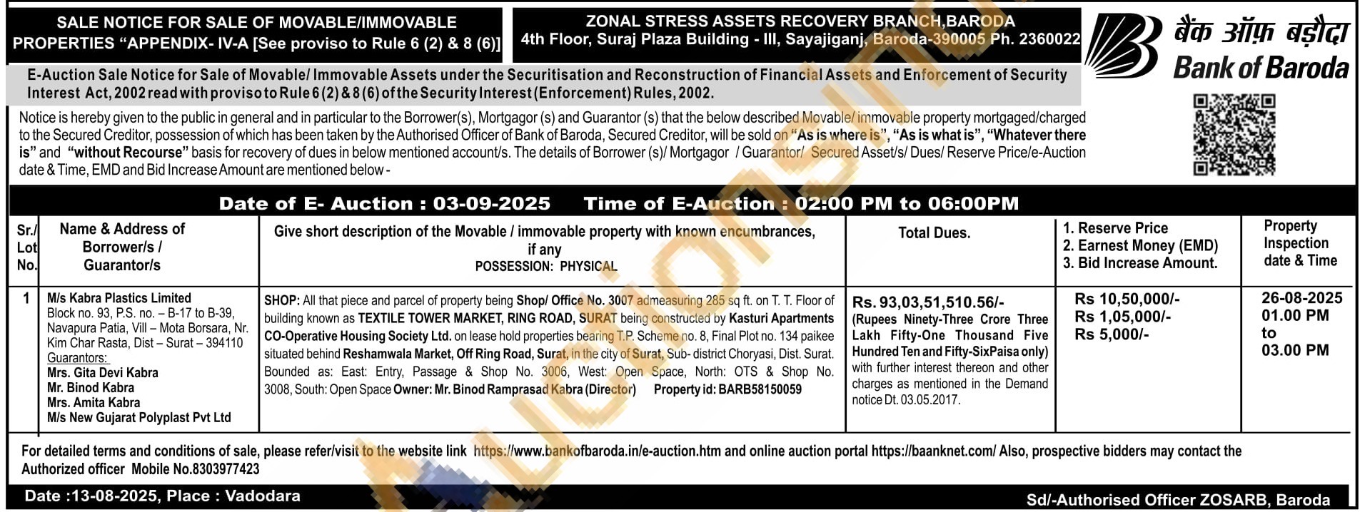 SHOP: All that piece and parcel of property being Shop/ Office No. 3007 admeasuring 285 sq ft. on T. T. Floor of building known as TEXTILE TOWER MARKET, RING ROAD, SURAT being constructed by Kasturi Apartments CO-Operative Housing Society Ltd. on lease hold properties bearing T.P. Scheme no. 8, Final Plot no. 134 paikee situated behind Reshamwala Market, Off Ring Road, Surat, in the city of Surat, Sub-district Choryasi, Dist. Surat. Bounded as: East: Entry, Passage & Shop No. 3006, West: Open Space, North: OTS & Shop No. 3008, South: Open Space Owner: Mr. Binod Ramprasad Kabra (Director) Property id: BARB58150059