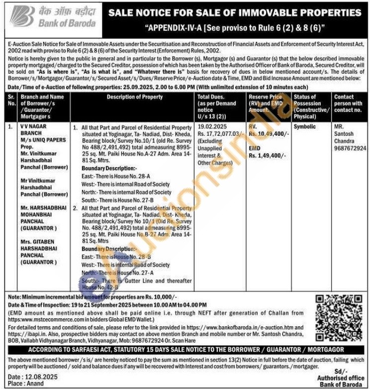 1. All that Part and Parcel of Residential Property situated at Yoginagar, Ta- Nadiad, Dist-Kheda, Bearing block/Survey No.10/1 (old Re. Survey No 488/2,491,492) total admeasuring 8995-25 sq. Mt. Paiki House No.A-27 Adm. Area 14-81 Sq. Mtrs.