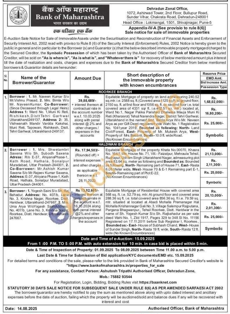 Contact Person: Ashutosh Tripathi Authorised Officer, Dehradun Zone, Mob.: 75882 93544
