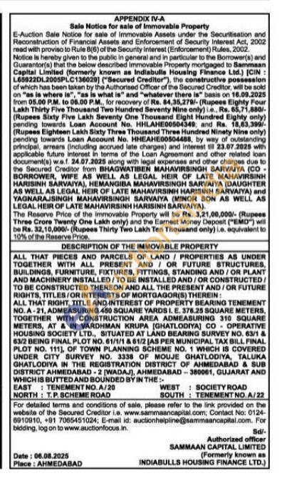 ALL THAT PIECES AND PARCELS OF LAND/ PROPERTIES AS UNDER TOGETHER WITH ALL PRESENT AND/OR FUTURE STRUCTURES, BUILDINGS, FURNITURE, FIXTURES, FITTINGS, STANDING AND/OR PLANT AND MACHINERY INSTALLED/TO BE INSTALLED AND/OR CONSTRUCTED/TO BE CONSTRUCTED THEREON AND ALL THE PRESENT AND/OR FUTURE RIGHTS, TITLES/OR INTERESTS OF MORTGAGOR(S) THEREIN: ALL THAT RIGHT, TITLE AND INTEREST OF PROPERTY BEARING TENEMENT NO.A-21, ADMEASURING 450 SQUARE YARDS I. E. 376.25 SQUARE METERS, TOGETHER WITH CONSTRUCTION AREA ADMEASURING 310 SQUARE METERS, AT & IN VARDHMAN KRUPA [GHATLODIYA) COOPERATIVE HOUSING SOCIETY LTD., SITUATED AT LAND BEARING SURVEY NO. 63/1 & 63/2 BEING FINAL PLOT NO. 61/1/1 & 61/2 JAS PER MUNICIPAL TAX BILL FINAL PLOT NO. 111], OF TOWN PLANNING SCHEME NO. 1 WHICH IS COVERED UNDER CITY SURVEY NO. 3338 OF MOUJE GHATLODIYA, TALUKA GHATLODIYA IN THE REGISTRATION DISTRICT OF AHMEDABAD & SUB DISTRICT AHMEDABAD-2 (WADAJ), AHMEDABAD-380061, GUJARAT AND WHICH IS BUTTED AND BOUNDED BY IN THE EAST TENEMENT NO.A/20