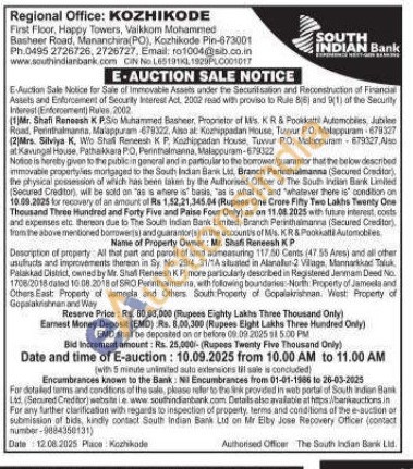 Description of property Al that part and parcel of land admeasuring 117.50 Gents (47.55 Ares) and all other sulruds and improvements thereon in Sy No. 29/4, 31/1A suated in Alanaller-2 Vilage, Mannarkkad Taluk Palakkad Distict, owned by Mr. Shall Reneesh K.P, more particularly described in Registered Jenmam Deed No 1708/2016 outed 10.08.2018 of SRO Printsalmanna, with following boundaries-North Property of Jameel and Others East: Property of Jamesla and Others South Property of Gopalakrishnan. West: Property of Gopalakrishnan and Way