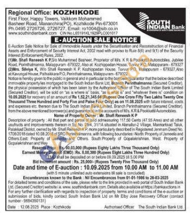 Description of property: All that part and parcel of land admeasuring 117.50 Cents (47.55 Ares) and all other usufructs and improvements thereon in Sy. No. 2914, 31/14 situated in Alanallur-2 Village, Mannarkica Taluk Palakkad District, owned by Mr. Shalt Reneesh KP. more particularly described in Registered Jenmam Desed No 17080018 dated 10.08.2018 of SRO Perinthalmanna, with following boundaries: North Property of Jameela and Others East: Property of Jamesla and Others South Property of Gopalakrishnan. West Property of Gopalakrishnan and Way