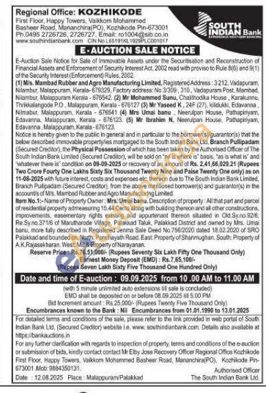 Item No.1:-Name of Property Owner: Mrs. Umai banu, Description of property: All that part and parcel of residential property admeasuring 15:44 Cents along with building thereon and all other constructions, improvements, easementary rights existing and appartenant thereon situated in Old. Syno.92/Re: Syno. 371/6 of Marutharode Village, Palakkad Taluk, Palakkad District and owned by Mins. Umai banu, more fully described in Registered Jenma Sale Deed No. 756/2020 dated 18.02.2020 of SRO Palakkad and bounded on, North. Panchayath Road East: Property of Shanmughan, South: Property of A.K. Rajasekharan. West: Mill & Property of Narayanan.