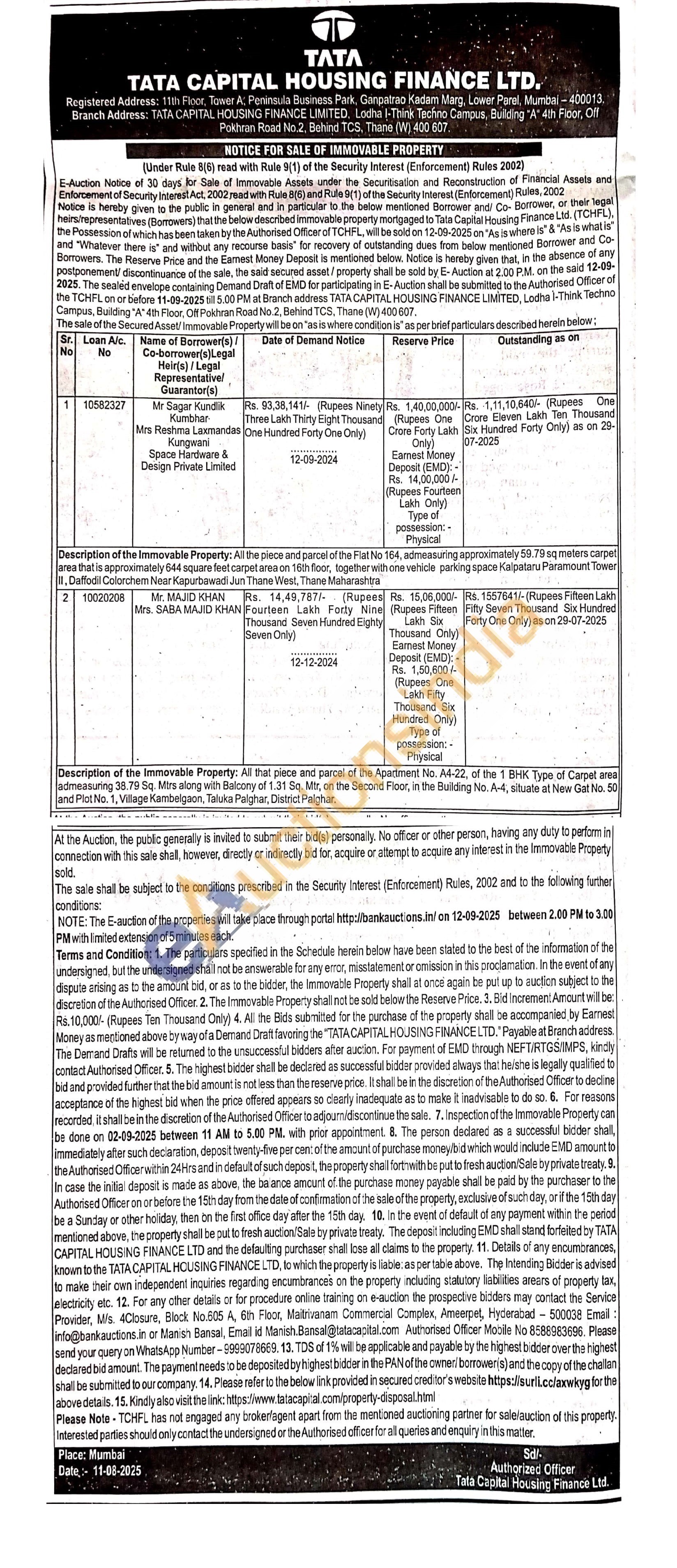 Description of the Immovable Property: All that piece and parcel of the Apartment No. A4-22, of the 1 BHK Type of Carpet area admeasuring 38.79 Sq. Mtrs along with Balcony of 1.31 Sq. Mtr, on the Second Floor, in the Building No. A-4, situate at New Gat No. 50 and Plot No. 1, Village Kambelgaon, Taluka Palghar, District Palghar
