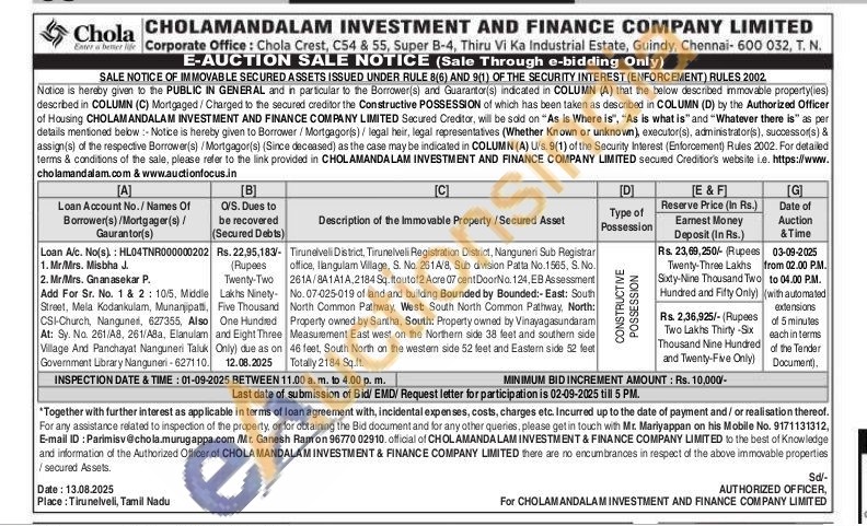 Tirunelveli District, Tirunelveli Registration District, Nanguneri Sub Registrar office, Ilangulam Village, S. No. 261A/8, Sub division Patta No. 1565, S. No. 261A/8A1A1A, 2184 Sq. ftoutof2 Acre 07 cent Door No. 124, EB Assessment No. 07-025-019 of land and building Bounded by Bounded:- East: South North Common Pathway, West: South North Common Pathway, North: Property owned by Santha, South: Property owned by Vinayagasundaram Measurement East west on the Northern side 38 feet and southern side 46 feet, South North on the western side 52 feet and Eastern side 52 feet Totally 2184 Sq.ft