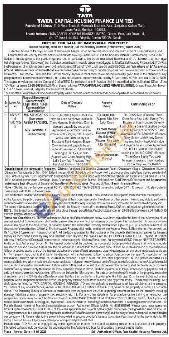 District: Palakkad Sub District: Ottapalam Taluk: Ottapalam Village Ottapalan -Il Limit: Ottapalam Municipality S. No: 100/1 Extent in Ares: 06.07 Schedule of the Property All that piece and parcel of land having an extent of 06.07 Ares in Sy No. 100/1 together with building bearing No. 8/1160 along with 1/5 right over (Road) an extent of 03.84 Ares in SY no. 100/1 situated at ottapalam-II Village, Taluk Ollapalam, Registration District Palakkad and Sub District of Ottapalam and Boundaries as follows: East: Property of Bava and Others North: Path way West: Property of Afsath South: Municipal Road Note:- SA filed by the Borrower against TCHFL (SA 350/2022/SA/240/2021) is pending before DRT I, Ernakulum, No stay order is passed against TCHFL in the said case