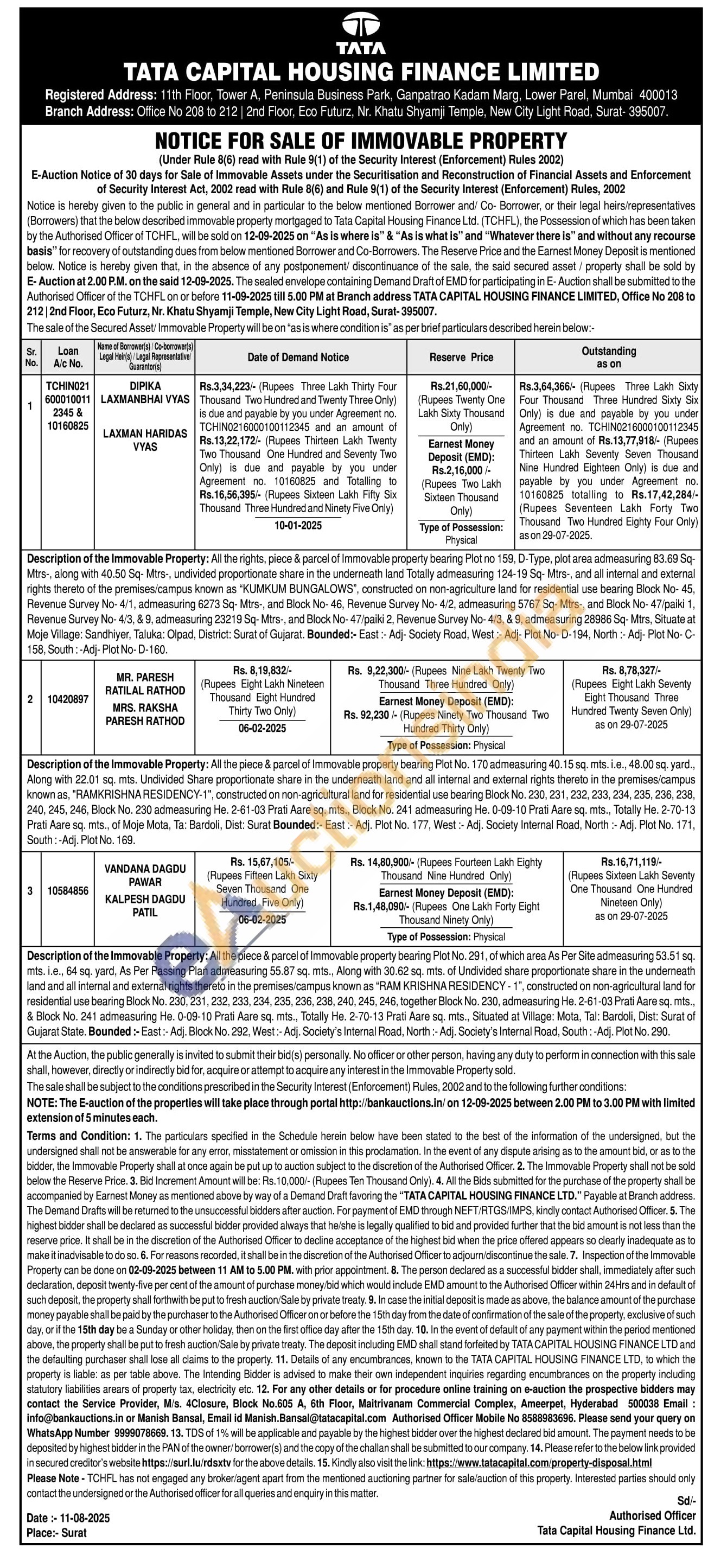 3) All the piece & parcel of Immovable property bearing Plot No. 291, of which area As Per Site admeasuring 53.51 sq. mts. i.e., 64 sq. yard, As Per Passing Plan admeasuring 55.87 sq. mts., Along with 30.62 sq. mts. of Undivided share proportionate share in the underneath land and all internal and external rights thereto in the premises/campus known as "RAM KRISHNA RESIDENCY-1", constructed on non-agricultural land for residential use bearing Block No. 230, 231, 232, 233, 234, 235, 236, 238, 240, 245, 246, together Block No. 230, admeasuring He. 2-61-03 Prati Aare sq. mts., & Block No. 241 admeasuring He. 0-09-10 Prati Aare sq. mts., Totally He. 2-70-13 Prati Aare sq. mts., Situated at Village: Mota, Tal: Bardoli, Dist: Surat of Gujarat State. Bounded:- East: Adj. Block No. 292, West:- Adj. Society's Internal Road, North: Adj. Society's Internal Road, South: -Adj. Plot No. 290