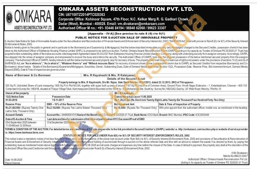 520 Sq. Ft, Undivided Share of Land measuring 1305 Sq. Ft in Plot NO.9A, together with super built up area of around 1167 Sq. Ft (inclusive of Common Area), Ground Floor, Vinoth Nagar Extension 1, Kelambakkam, Chennai-603 103 Comprised in Survey No. 1483/1B, situated at Thaiyur Village Taluk, Kancheepuram District Bounded on the: North by: B GMohanaraja Site: South by: Survey No.1483/2A2; East by: 20° Wide Road; Westby: Plot No. 10