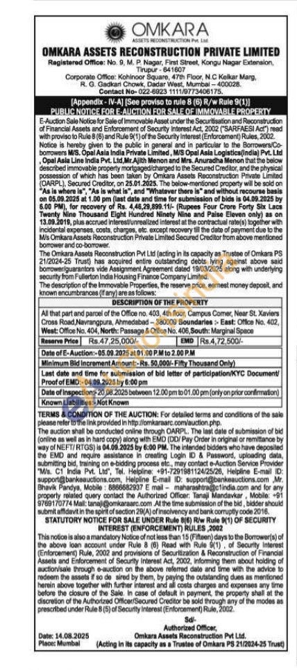 All that part and parcel of the Office no. 403, 4th floor, Campus Comer, Near St. Xaviers Cross Road, Navrangpura, Ahmedabad-380009 Boundaries: East: Office No. 402, West: Office No. 404, North: Passage & Office No. 406, South: Marginal Space