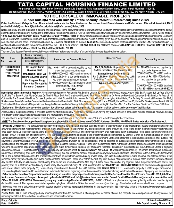 All that piece and parcel of Residential Flat Bearing Unit No. 501, Measuring About Covered Area of 1130 Sq. Ft. Super Buit Up Area of 1356 Sq. Ft. Be The Same A Little More Or Less On The 5th Floor, Built And Constructed Upon All That Piece And Parcel Of Revenue Free Land Contanied By Estimation An Area of 10 Cottahs Be The Same A Little More Or Less Together With Multi Storied Building Known As "centre Point Situate Lying At And Being The Entirely Of Municipal Premises No. 28/2, Shakespeare Sarani (formerly A Demrcated Portion of Municipal Premise No. 288, Shakespeare Sarani) Kolkata-700017, Under Ward No. 63, Under P.s. Shakespeare Sarani, Within The Limits of Kolkata Municipal Corporation and being the Demarcated in the Town of Kolkata Comprised In Holding No. 9 of Block No. 12 In The Southern Division of The Town Of Kolkata
