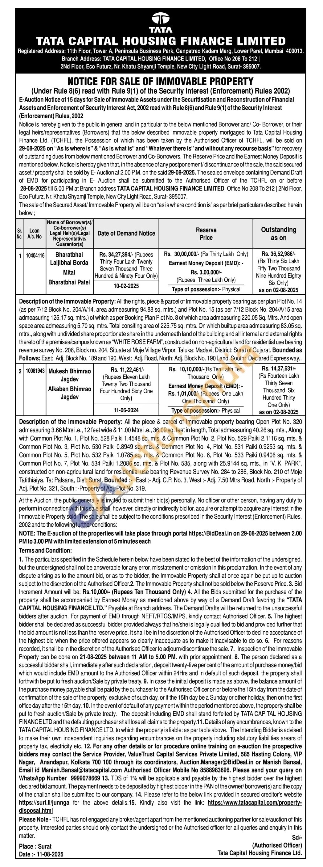 1) All the rights, piece & parcel of Immovable property bearing as per plan Plot No. 14 (as per 7/12 Block No. 204/A/14, area admeasuring 94.88 sq. mtrs.) and Plot No. 15 (as per 7/12 Block No. 204/A/15 area admeasuring 125.17 sq. mtrs.) of which as per Booking Plan Plot No. 8 of which area admeasuring 220.05 Sq. Mtrs. And open space area admeasuring 5.70 sq. mtrs. Total consiting area of 225.75 sq. mtrs. On which builtup area admeasuring 83.05 sq. mtrs., along with undivided share proportionate share in the underneath land of the building and all internal and external rights thereto of the premises/campus known as "WHITE ROSE FARM", constructed on non-agricultural land for residential use bearing revenue survey No. 206, Block no. 204, Situate at Moje Village Virpor, Taluka: Madavi, District: Surat of Gujarat. Bounded as Follows; East: Adj. Block No. 189 and 190, West: Adj. Road, North: Adj, Block No. 190 Land, South: Declared Express way
