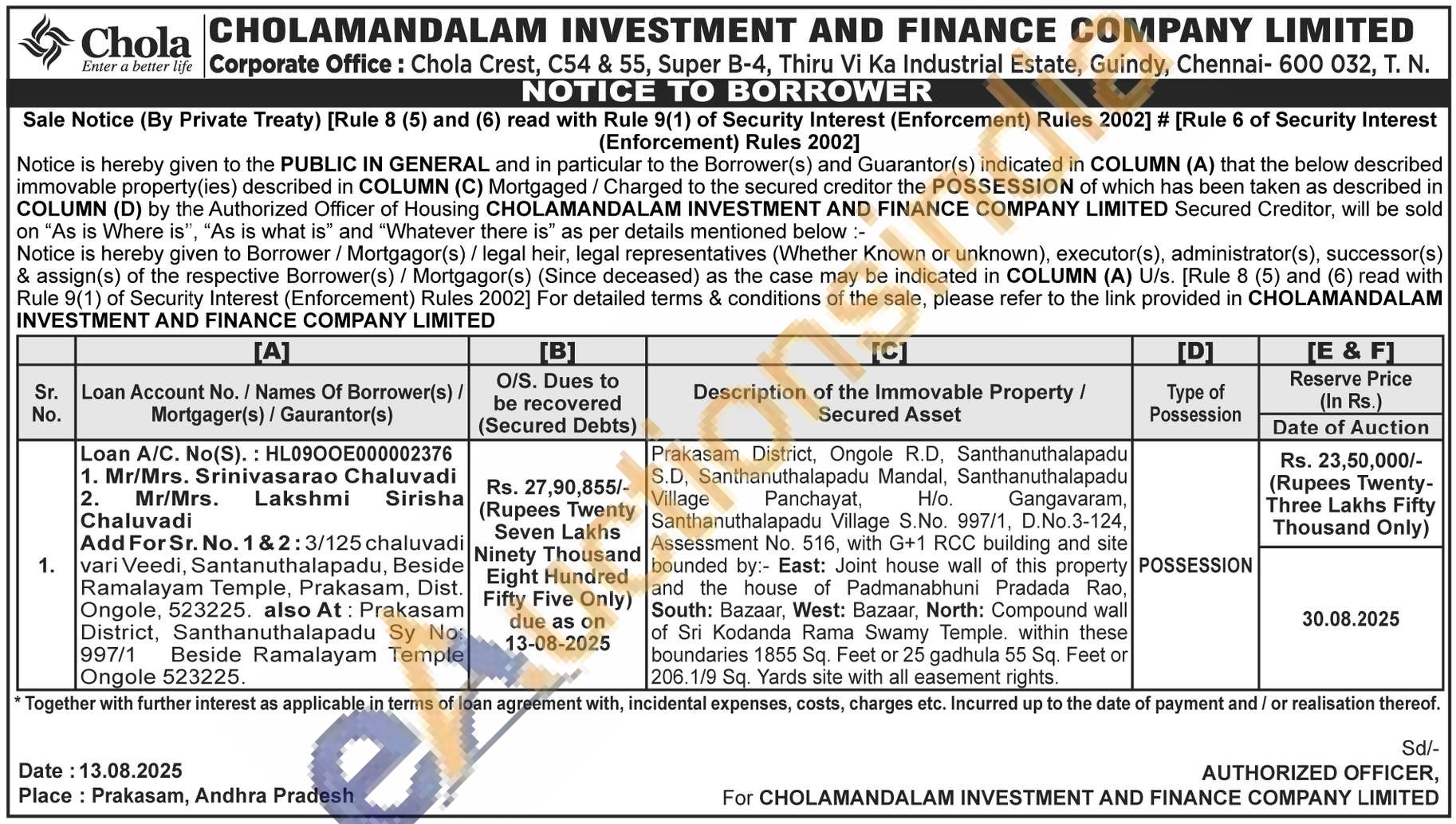 Prakasam District, Ongole R.D, Santhanuthalapadu S.D, Santhanuthalapadu Mandal, Santhanuthalapadu Village Panchayat, H/o. Gangavaram, Santhanuthalapadu Village S.No. 997/1, D.No.3-124, Assessment No. 516, with G+1 RCC building and site bounded by:- East: Joint house wall of this property and the house of Padmanabhuni Pradada Rao, South: Bazaar, West: Bazaar, North: Compound wall of Sri Kodanda Rama Swamy Temple, within these boundaries 1855 Sq. Feet or 25 gadhula 55 Sq. Feet or 206.1/9 Sq. Yards site with all easement rights