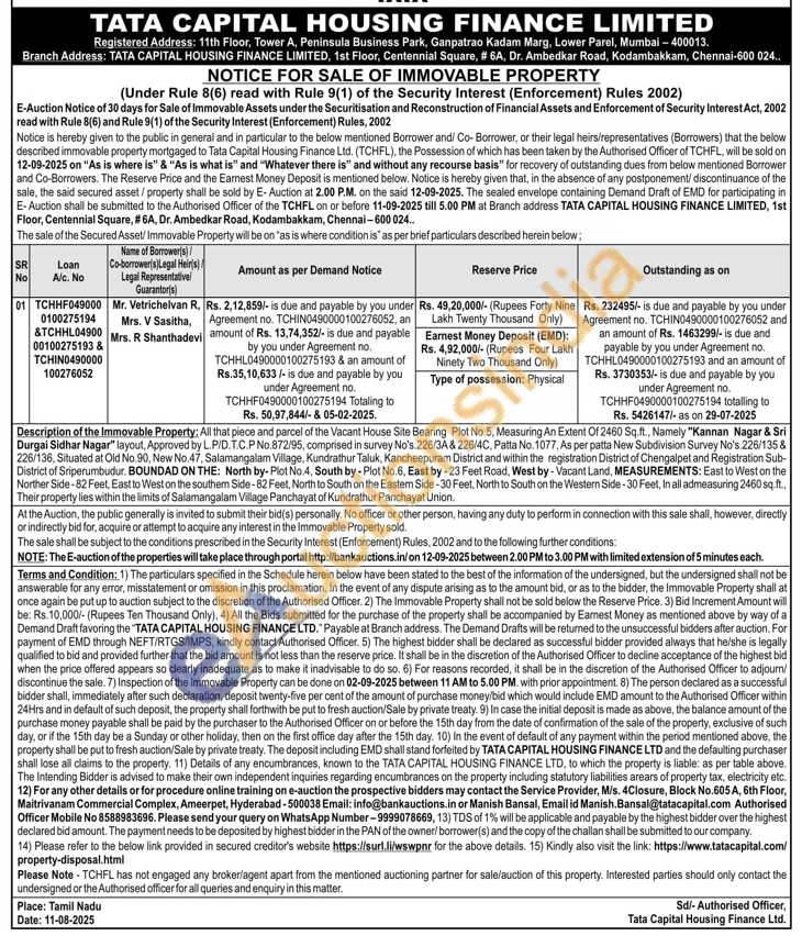 All that piece and parcel of the Vacant House Site Bearing Plot No.5, Measuring An Extent Of 2460 Sq.ft., Namely "Kannan Nagar & Sri Durgai Sidhar Nagar" layout, Approved by L.P/D.T.C.P No.872/95, comprised in survey No's. 226/3A & 226/4C, Patta No. 1077, As per patta New Subdivision Survey No's. 226/135 & 226/136, Situated at Old No.90, New No.47, Salamangalam Village, Kundrathur Taluk, Kancheepuram District and within the registration District of Chengalpet and Registration Sub-District of Sriperumbudur. BOUNDAD ON THE: North by-Plot No.4, South by Plot No.6, East by-23 Feet Road, West by-Vacant Land, MEASUREMENTS: East to West on the Norther Side-82 Feet, East to West on the southern Side-82 Feet, North to South on the Eastem Side-30 Feet, North to South on the Western Side-30 Feet, In all admeasuring 2460 sq.ft., Their property lies within the limits of Salamangalam Village Panchayat of Kundrathur Panchayat Union