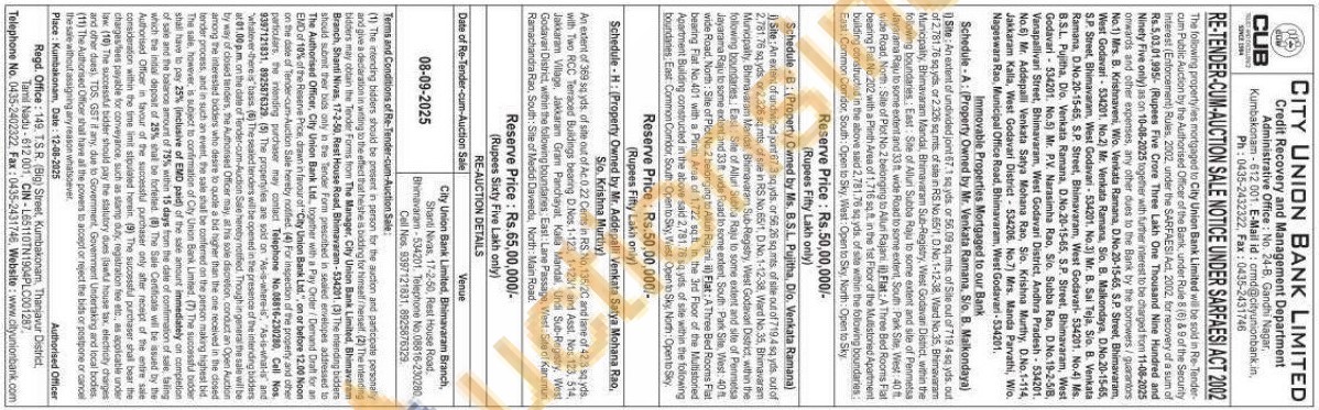 1) Site: An extent of undivided joint 67.3 sq yds. or 56.26 sq.mts. of site out of 719.4 sq yds. out of 2,781.76 sq-yds or 2,326 sq mts, of site in RS No.65/1, D.No. 1-12-38, Ward No.35, Bhimavaram Municipality, Bhimavaram Mandal, Bhimavaram Sub-Registry, West Godavari District, within the following boundaries: East: Site of Alluri Subba Raju to some extent and site of Penmetsa Jayarama Raju to some extent and 33 ft. wide Road to some extent, South Park Site, West: 40 fL wide Road, North: Site of Plot No 2 belonging to Alluri Rajani. il) Flat: A Three Bed Rooms Flat bearing Flat No.401 with a Plinth Area of 1,722 sq.ft. in the 3rd Floor of the Multistoried Apartment Building constructed in the above said 2,781.76 sq yds of site within the following boundaries: East Common Comidor, South: Open to Sky, West: Open to Sky, North: Open to Sky