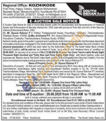 All that part and parcel of land admeasuring 26.91 Arus along with all constructions improvements, essamentary nights existing and appurienant thereon situated in Sy No. 3/1418 within Thachonattukara Village, Mannarkad Taluk Palakkad District and owned try Mr. Siyad Rahman PT, morefully described in Assignment Deed No. 2267/1999 dated 04.06.1999 of Sub Registrar Office Mannarkkad and bounded on (as per Deed No 2267/1999), North Property of Thodievakkappu South: Road East. Property of Thoduvakkappu West Property assigned to Siyavul Haq