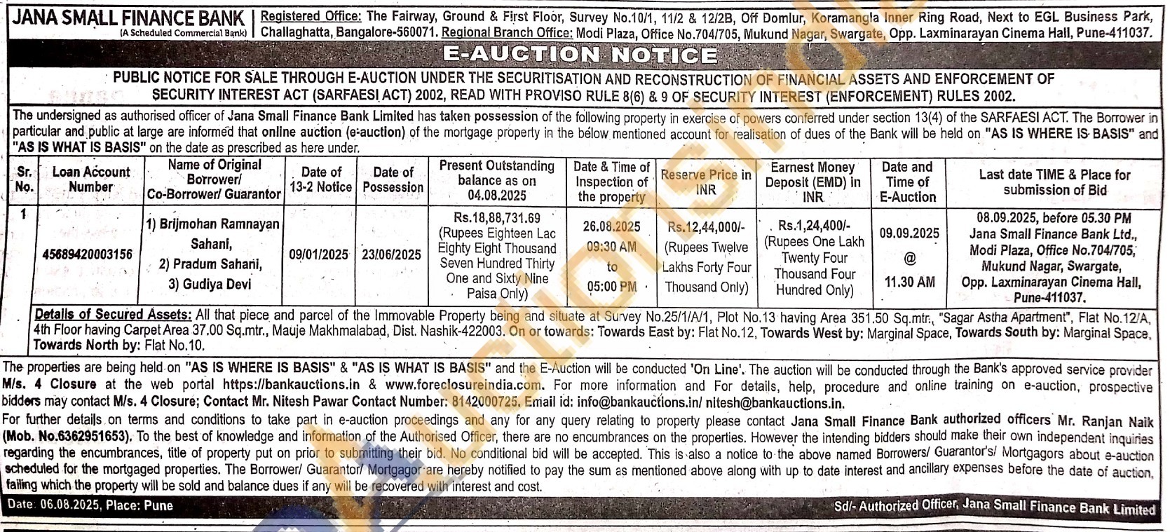 Details of Secured Assets: All that piece and parcel of the Immovable Property being and situate at Survey No.25/1/A/1, Plot No.13 having Area 351.50 Sq.mtn, "Sagar Astha Apartment", Flat No.12/A, 4th Floor having Carpet Area 37.00 Sq.mtr., Mauje Makhmalabad, Dist. Nashik-422003. On or towards: Towards East by: Flat No.12, Towards West by: Marginal Space, Towards South by: Marginal Space, Towards North by: Flat No.10.
