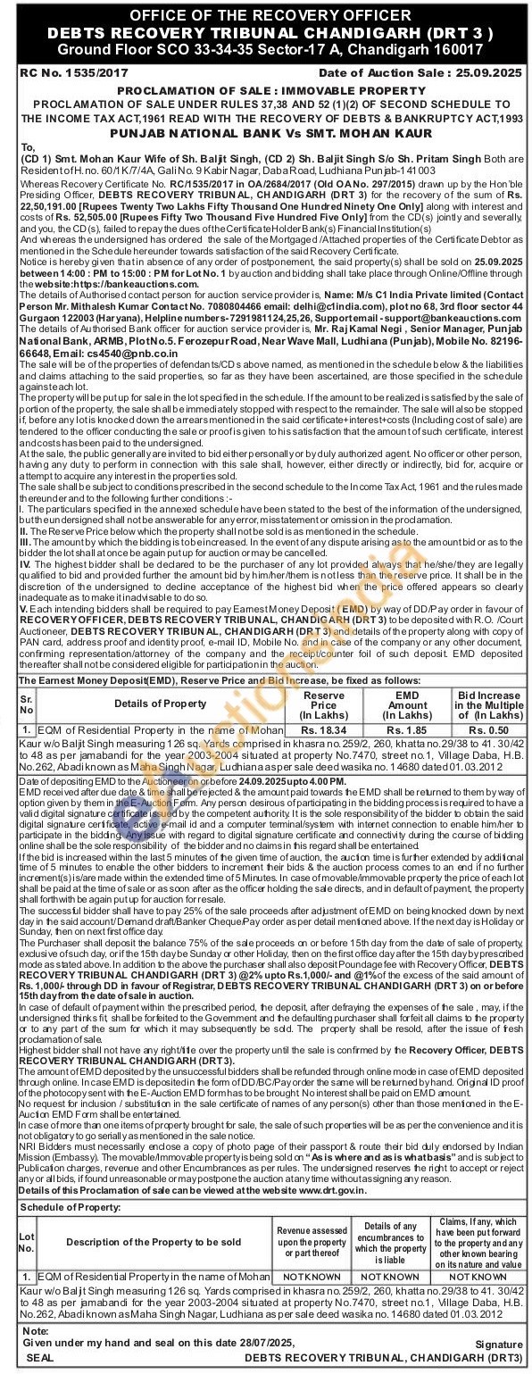 EQM of Residential Property in the name of Mohan Kaur w/o Baljit Singh measuring 126 sq. Yards comprised in khasra no. 259/2, 260, khatta no.29/38 to 41. 30/42 to 48 as per jamabandi for the year 2003-2004 situated at property No.7470, street no. 1, Village Daba, H.B. No.262, Abadi known as Maha Singh Nagar, Ludhiana asper sale deed wasika no. 14680 dated 01.03.2012