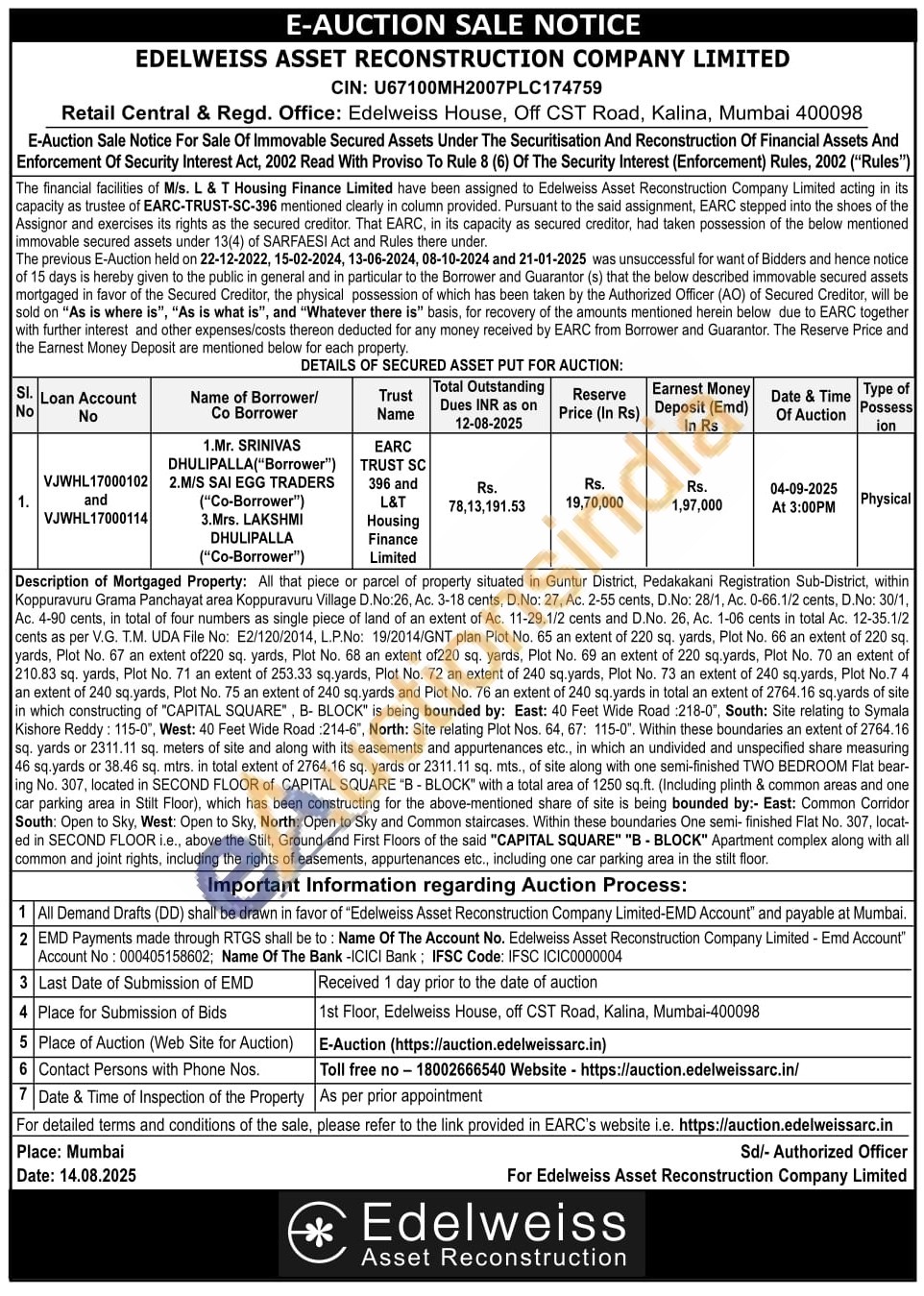 All that piece or parcel of property situated in Guntur District, Pedakakani Registration Sub-District, within Koppuravuru Grama Panchayat area Koppuravuru Village D.No:26, Ac. 3-18 cents, D.No: 27, Ac. 2-55 cents, D.No: 28/1, Ac. 0-66.1/2 cents, D.No: 30/1, Ac. 4-90 cents, in total of four numbers as single piece of land of an extent of Ac. 11-29.1/2 cents and D.No. 26, Ac. 1-06 cents in total Ac. 12-35.1/2 cents as per V.G. T.M. UDA File No: E2/120/2014, L.P.No: 19/2014/GNT plan Plot No. 65 an extent of 220 sq. yards, Plot No. 66 an extent of 220 sq. yards, Plot No. 67 an extent of220 sq. yards, Plot No. 68 an extent of220 sq. yards, Plot No. 69 an extent of 220 sq.yards, Plot No. 70 an extent of 210.83 sq. yards, Plot No. 71 an extent of 253.33 sq yards, Plot No. 72 an extent of 240 sq.yards, Plot No. 73 an extent of 240 sq.yards, Plot No.7 4 an extent of 240 sq.yards, Plot No. 75 an extent of 240 sq.yards and Plot No. 76 an extent of 240 sq.yards in total an extent of 2764.16 sq.yards of site in which constructing of "CAPITAL SQUARE", B-BLOCK" is being bounded by: East: 40 Feet Wide Road:218-0", South: Site relating to Symala Kishore Reddy: 115-0", West: 40 Feet Wide Road 214-6", North: Site relating Plot Nos. 64, 67: 115-0", Within these boundaries an extent of 2764.16 sq. yards or 2311.11 sq. meters of site and along with its easements and appurtenances etc., in which an undivided and unspecified share measuring 46 sq.yards or 38.46 sq. mtrs. in total extent of 2764.16 sq. yards or 2311.11 sq. mts., of site along with one semi-finished TWO BEDROOM Flat bear-ing No. 307, located in SECOND FLOOR of CAPITAL SQUARE "B-BLOCK" with a total area of 1250 sq.ft. (Including plinth & common areas and one car parking area in Stilt Floor), which has been constructing for the above-mentioned share of site is being bounded by:- East: Common Corridor South: Open to Sky, West: Open to Sky, North: Open to Sky and Common staircases. Within these boundaries One semi-finished Flat No. 307, locat-ed in SECOND FLOOR i.e., above the Stilt, Ground and First Floors of the said "CAPITAL SQUARE" "B-BLOCK" Apartment complex along with all common and joint rights, including the rights of easements, appurtenances etc., including one car parking area in the stilt floor