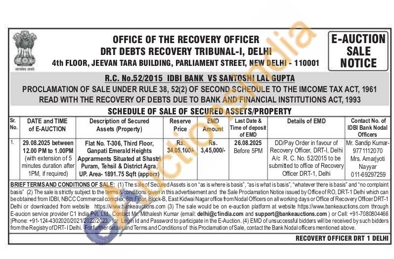 Flat No. T-306, Third Floor, Ganpati Emerald Heights Apprarments Situated at Shastri Puram, Tehsil & District Agra, UP. Area- 1891.75 Sqft (apporx