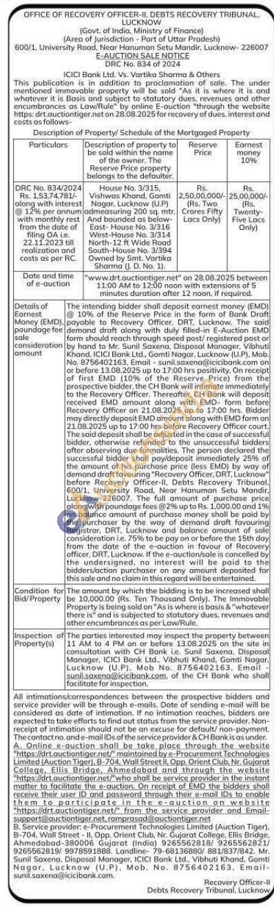 House No. 3/315, Vishwas Khand, Gomti Nagar, Lucknow (UP) admeasuring 200 sq. mtr. And bounded as below-East-House No. 3/316 West-House No. 3/314 North-12 ft Wide Road South-House No. 3/394 Owned by Smt. Vartika Sharma (J. D. No. 1).