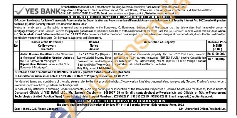 All that parcel of immovable property Flat no.C-202 2nd Floor, Tower-C admeasuring 70.14 sq.mtrs. Known as "SHREEJI FLATS "bearing Consolidation City Survey no. 1560 admeasuring 250.75 sq.mtrs. Of Moje Village: Vadsar Registration Sub District and District: Vadodara