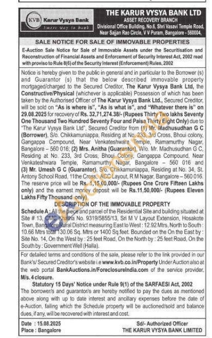 Schedule A: All the piece and parcel of the Residential Site and building situated at Site #13, CMC Khatha No. 9319/5855/13, Sri MV Layout Extension, Hosakote Town, Bangalore Rural District measuring East to West: 12.92 Mtrs, North to South 10.66 Mtrs total 130.06 Sq. Mirs or 1400 Sq.feet. Bounded on the On the East by: Site No. 14, On the West by: 25 feet Road, On the North by: 25 feet Road. On the South by: Government Well (Halla).