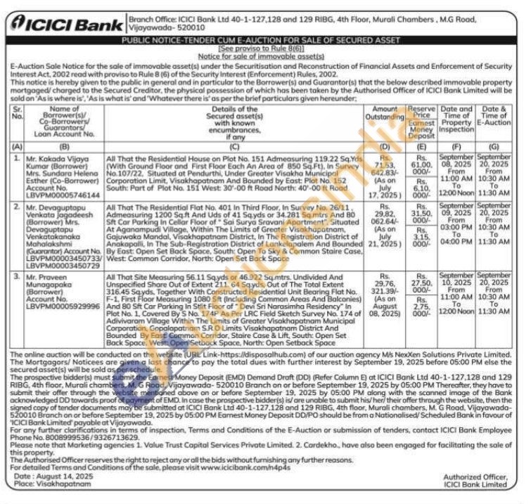 2) All That The Residential Flat No. 401 in Third Floor, In Survey No. 26/11. Admeasuring 1200 Sq.ft And Uds of 41 Sqyds or 34.281 Sq.mtrs And 80 Sft Car Parking in Cellar Floor of Sai Surya Sravani Apartment", Situated At Aganampudi Village, Within The Limits of Greater Visakhapatnam, Gajuwaka Mandal, Visakhapatnam District, In The Registration District of Anakapalli, In The Sub-Registration District of Lankelapalem And Bounded By East: Open Set Back Space, South: Open To Sky & Common Staire Case. West: Common Corridor, North: Open Set Back Space