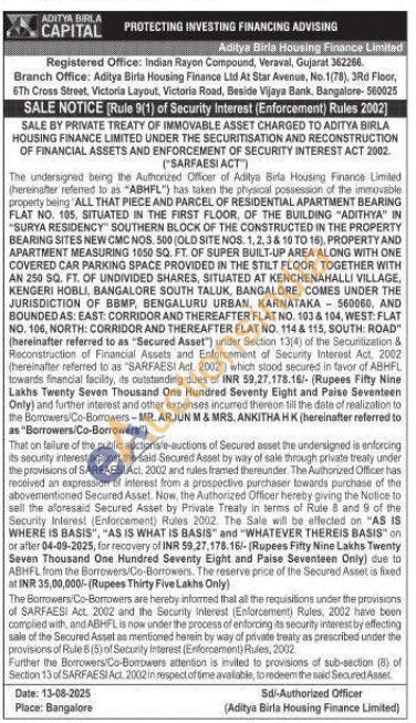 ALL THAT PIECE AND PARCEL OF RESIDENTIAL APARTMENT BEARING FLAT NO. 105, SITUATED IN THE FIRST FLOOR, OF THE BUILDING "ADITHYA" IN "SURYA RESIDENCY SOUTHERN BLOCK OF THE CONSTRUCTED IN THE PROPERTY BEARING SITES NEW CMC NOS, 500 (OLD SITE NOS. 1, 2, 3 & 10 TO 16), PROPERTY AND APARTMENT MEASURING 1050 SQ. FT. OF SUPER BUILT-UP AREA ALONG WITH ONE COVERED CAR PARKING SPACE PROVIDED IN THE STILT FLOOR, TOGETHER WITH AN 250 SQ. FT. OF UNDIVIDED SHARES, SITUATED AT KENCHENAHALLI VILLAGE, KENGERI HOBLI, BANGALORE SOUTH TALUK, BANGALORE, COMES UNDER THE JURISDICTION OF BBMP, BENGALURU URBAN, KARNATAKA 560000, AND BOUNDED AS: EAST: CORRIDOR AND THEREAFTER FLAT NO. 103 & 104, WEST: FLAT NO. 106, NORTH: CORRIDOR AND THEREAFTER FLAT NO. 114 & 115, SOUTH: ROAD"