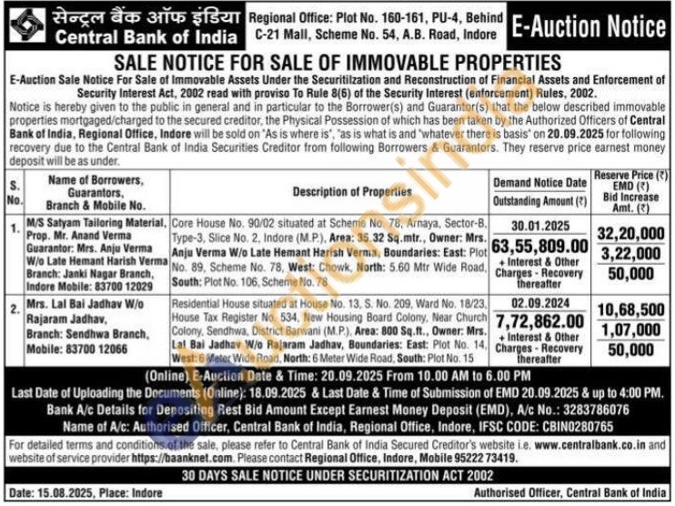 Residential House situated at House No. 13, S. No. 209, Ward No. 18/23, Colony, Sendhwa, District Barwani (MP), Area: 800 Sq.ft., Owner. Mrs. Lal Bai Jadhav W/o Rajaram Jadhav, Boundaries: East: Plot No. 14. West: 6 Meter Wide Road, North: 6 Meter Wide Road, South: Plot No. 15