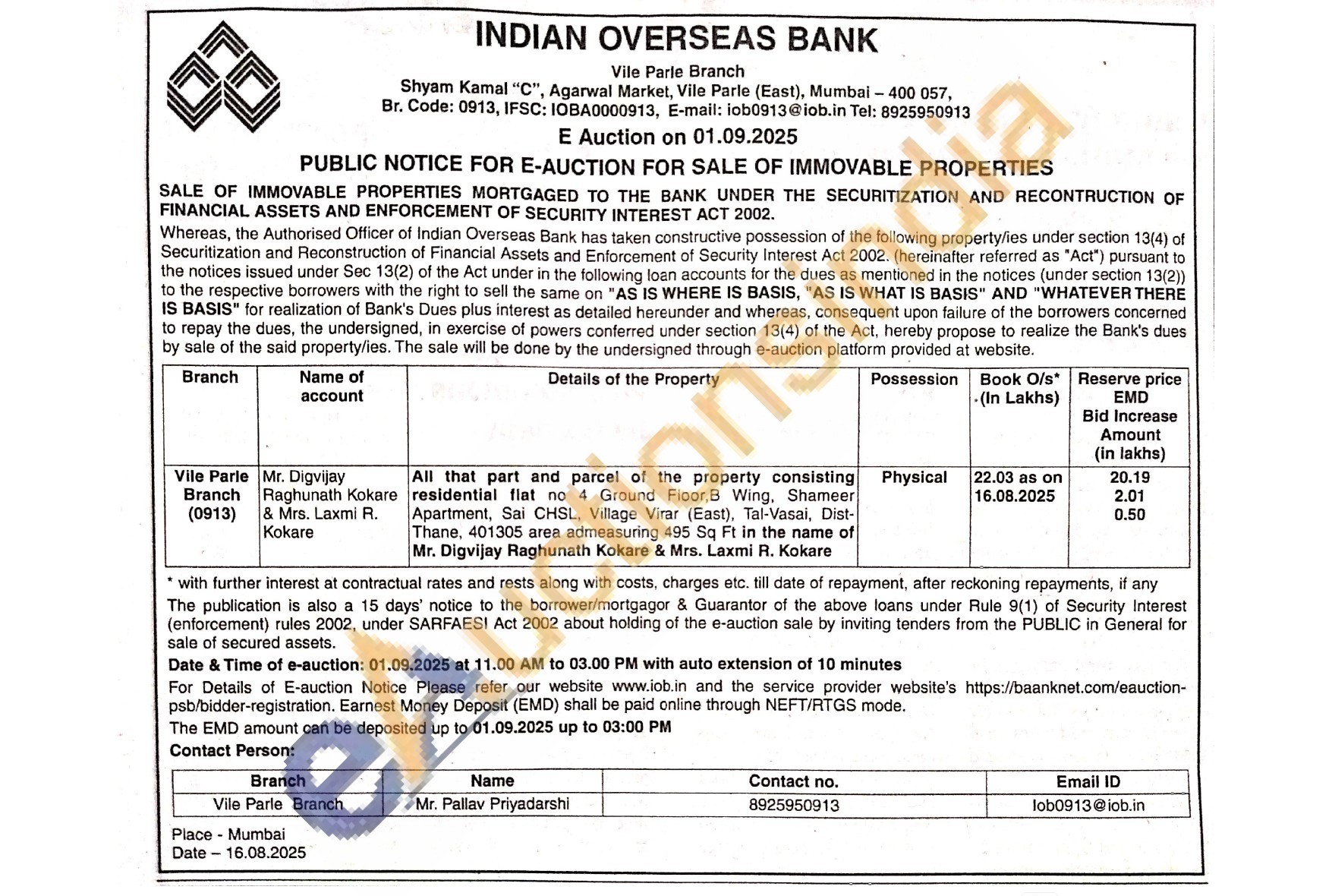 All that part and parcel of the property consisting residential flat no 4 Ground Floor, B Wing, Shameer Apartment, Sai CHSL, Village Virar (East), Tal-Vasai, Dist-Thane, 401305 area admeasuring 495 Sq Ft in the name of Mr. Digvijay Raghunath Kokare & Mrs. Laxmi R. Kokare
