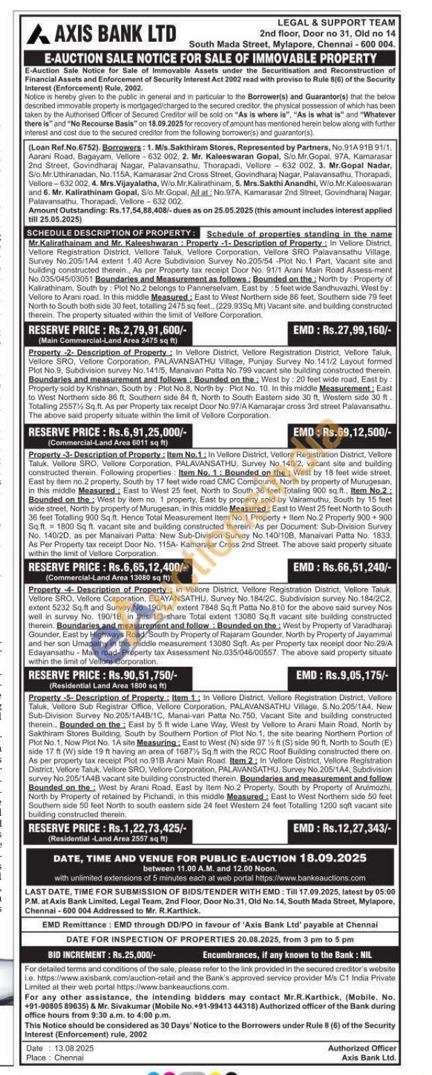 Property-3-Description of Property: Item No.1; In Vellore District, Vellore Registration District, Vellore Taluk, Vellore SRO, Vellore Corporation, PALAVANSATHU, Survey No. 140/2, vacant site and building constructed therein. Following properties: Item No. 1: Bounded on the West by 18 feet wide street. East by item no.2 property, South by 17 feet wide road CMC Compound, North by property of Murugesan, in this middle Measured: East to West 25 feet, North to South 36 feet Totaling 900 sq.ft., Item No.2: Bounded on the West by item no. 1 property, East by property sold by Vairamuthu, South by 15 feet wide street, North by property of Murugesan, in this middle Measured: East to West 25 feet North to South 36 feet Totalling 900 Sq.ft. Hence Total Measurement Item No.1 Property + Item No.2 Property 900 + 900 Sq.ft. 1800 Sq ft. vacant site and building constructed therein. As per Document: Sub-Division Survey No. 140/2D, as per Manaivari Patta: New Sub-Division Survey No. 140/10B, Manaivari Patta No. 1833, As Per Property tax receipt Door No. 115A- Kamarajar Cross 2nd Street. The above said property situate within the limit of Vellore Corporation.