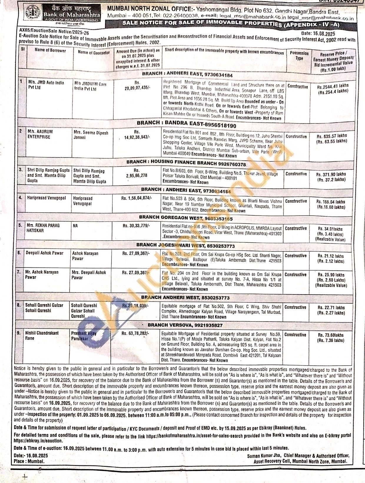 Equitable Mortgage of Residential property situated at Survey No.59, Hissa No.1(P) of Mouje Patharli, Taluka Kalyan Dist. Kalyan, Flat No.2 on Ground Floor, Building No. A, admeasuring 925 sq. ft. carpet area in the building known as Jawahar Darshan Co-op. Hsg Soc. Ltd., situated at Shreekhandewadi Manpada Road, Dombivli East 421201, Tal Kalyaan Dist. Thane. Encumbrances- Not Known